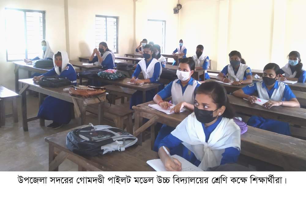 মঙ্গলবার (২৮ সেপ্টেম্বর) সকালে উপজেলার পূর্ণ চন্দ্র সেন (পি সি সেন) সারোয়াতলি উচ্চ বিদ্যালয়, কধুরখীল বালিকা উচ্চ বিদ্যালয়, উপজেলা সদরের গোমদন্ডী পাইলট মডেল উচ্চ বিদ্যালয় ও গোমদন্ডী সরকারি আদর্শ প্রথমিক বিদ্যালয় ঘুরে দেখা গেছে, প্রাথমিকে শিক্ষার্থীদের উপস্থিতি একটু কম হলেও মাধ্যমিকের শ্রেণি কক্ষে বেড়েছে শিক্ষার্থীদের উপস্থিতি। বিদ্যালয় প্রবেশের সময় হাত ধোয়া, মুখে মাস্ক নিশ্চিত করছেন বিদ্যালয় কর্তৃপক্ষ। তবে শিক্ষার্থীদের মাঝে দূরত্ব বজায় রাখা যাচ্ছে না। বিদ্যালয়ে শিক্ষার্থীদের আসা যাওয়ার সময় দূরত্ব বজায় রেখে চলা কঠিন বলে জানিয়েছেন শিক্ষকরা।