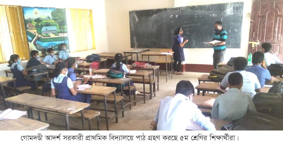 গোমদন্ডী আদর্শ সরকারী প্রাথমিক বিদ্যালয়ের ৩টি কক্ষে ৫ম শ্রেণীর শিক্ষার্থীরা সুশৃঙ্খলভাবে পাঠ নিতে দেখা যায়। স্বাস্থ্যবিধি মেনে চলতে দেখা গেছে তাদের।