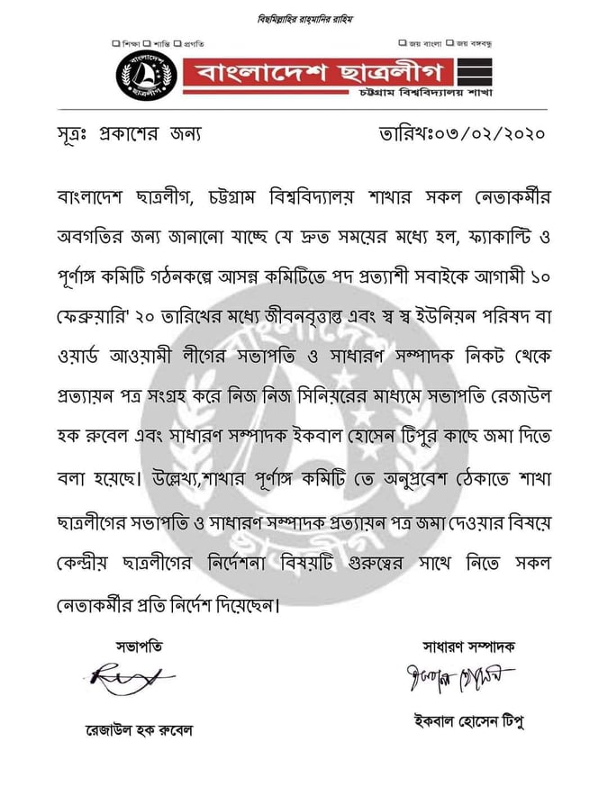চট্টগ্রাম বিশ্ববিদ্যালয় (চবি) শাখা ছাত্রলীগের পূর্ণাঙ্গ কমিটিতে পদ প্রত্যাশীদের জীবনবৃত্তান্ত ও স্থানীয় আওয়ামীলীগ থেকে প্রত্যায়পত্র জমার দেওয়ার আহ্বান করা হয়েছে।