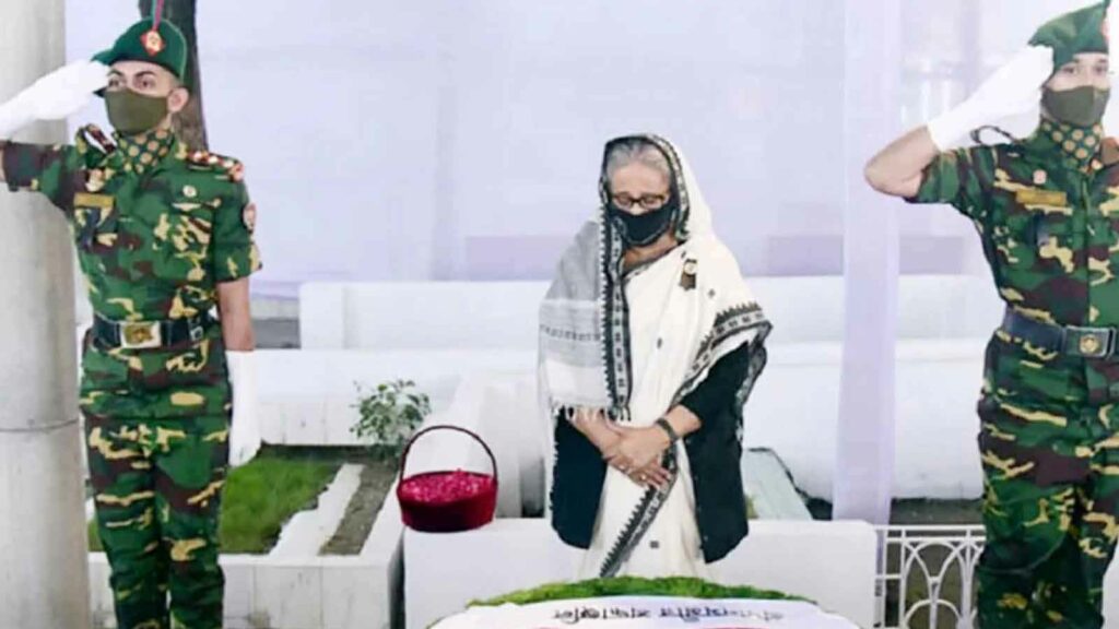 পুষ্পস্তবক অর্পণ শেষে বঙ্গবন্ধুকন্যা কিছুক্ষণ নীরবে দাঁড়িয়ে থাকেন। পরে সেখানে সমাহিত স্বজনদের কবরে ফুলের পাপড়ি ছিটিয়ে দেন। এবং নিহত স্বজনদের স্মরণ করে দুই হাত তুলে মোনাজাতও করেন।