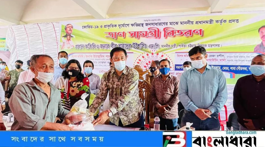 অনুষ্ঠানের আলোচনা শেষে মন্ত্রী পৌর এলাকার ক্ষতিগ্রস্ত ২ হাজার পরিবারের মাঝে দূর্যোগ ও ত্রাণ মন্ত্রণালয়ের সহযোগিতায় চাল, তেল, ডাল, লবন, আলু, ৫৫ পরিবারের মাঝে ঢেউটিন ও নগদ টাকা, বান্দরবান জেলা পরিষদের সহায়তায় ৯০ পরিবারের মাঝে নগদ টাকা প্রদান করেন।