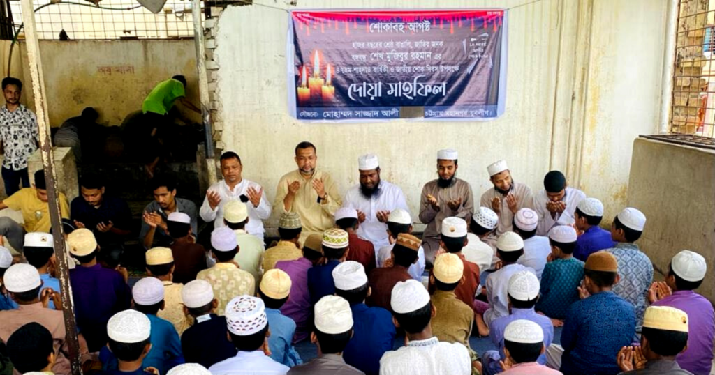 সোমবার (১৫ আগস্ট) চান্দগাঁও আবাসিক এলাকার মোহাম্মদিয়া ফয়জুল উলুম মাদরাসা ও এতিমখানায় এ খতমে কোরআন ও দোয়া মাহফিল অনুষ্ঠিত হয়।