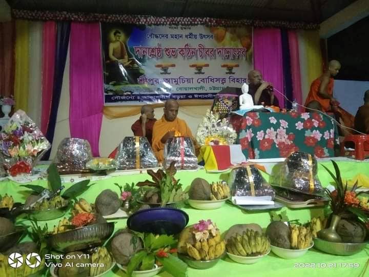 চট্টগ্রামের বোয়ালখালীর শ্রীপুর আমুচিয়া বোধিসত্ত্ব বিহারে দানোত্তম কঠিন চীবর দান অনুষ্ঠিত হয়েছে। এ উপলক্ষে শুক্রবার (২১ অক্টোবর) গ্রামের দায়ক/দায়িকাদের উদ্যেগে দিনব্যাপী নানান কর্মসূচী গ্রহণ করা হয়।