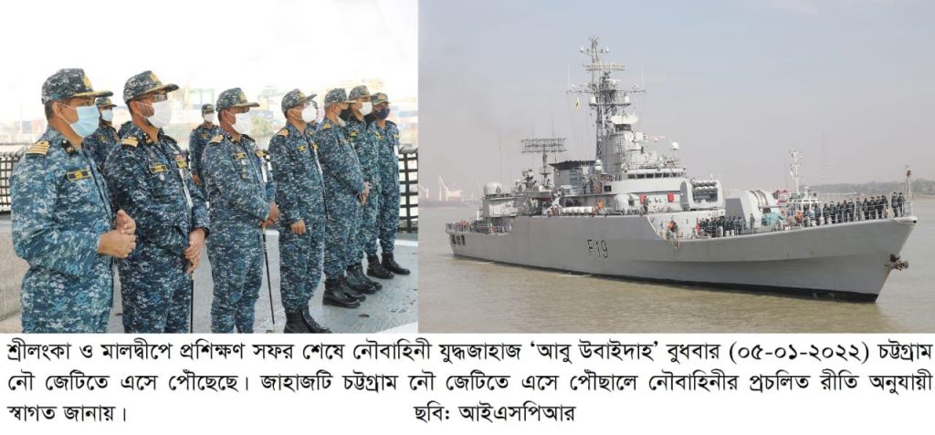 শ্রীলংকা ও মালদ্বীপে প্রশিক্ষণ সফর শেষে নৌবাহিনী যুদ্ধজাহাজ ‘আবু উবাইদাহ’ বুধবার (০৫-০১-২০২২) চট্টগ্রাম নৌ জেটিতে এসে পৌঁছেছে। জাহাজটি চট্টগ্রাম নৌ জেটিতে এসে পৌঁছালে নৌবাহিনীর প্রচলিত রীতি অনুযায়ী সুসজ্জিত বাদকদল বাদ্য যন্ত্র পরিবেশনের মাধ্যমে স্বাগত জানায়। এ সময় বানৌজা ঈসাখানের অধিনায়কসহ স্থানীয় পদস্থ নৌ কর্মকর্তা এবং নাবিকবৃন্দ উপস্থিত ছিলেন।