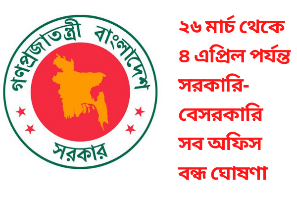 ২৬ মার্চ উপলক্ষে সরকারি ছুটির সঙ্গে ২৯ মার্চ থেকে ২ এপ্রিল মোট ৫ দিন যুক্ত করে ছুটি ঘোষণা করা হয়েছে। এর সঙ্গে ৩ ও ৪ এপ্রিল সরকারি সাধারণ ছুটিও যুক্ত হবে। অর্থাৎ আগামী ২৬ মার্চ থেকে ৪ এপ্রিল মোট ১০ দিন ছুটি থাকবে।