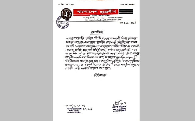 বিশ্ববিদ্যালয় ছাত্রলীগের দপ্তর সম্পাদক আবুল বাশার বলেন, রোববার রাতে কেন্দ্রীয় ছাত্রলীগের কেন্দ্রীয় ছাত্রলীগের ভারপ্রাপ্ত সভাপতি আল-নাহিয়ান খান জয় ও সাধারণ সম্পাদক লেখক ভট্টাচার্য সাক্ষরিত এক সংবাদ বিজ্ঞপ্তিতে এ তথ্য জানানো হয়।