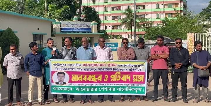 গাজীপুরে সাংবাদিক আসাদুজ্জামান তুহিন হত্যার বিচারের দাবি এবং সারাদেশে সাংবাদিকদের উপর হামলা ও নির্যাতনের প্রতিবাদে মানববন্ধন করেছে চট্টগ্রামের আনোয়ারা উপজেলার পেশাদার সাংবাদিকরা।