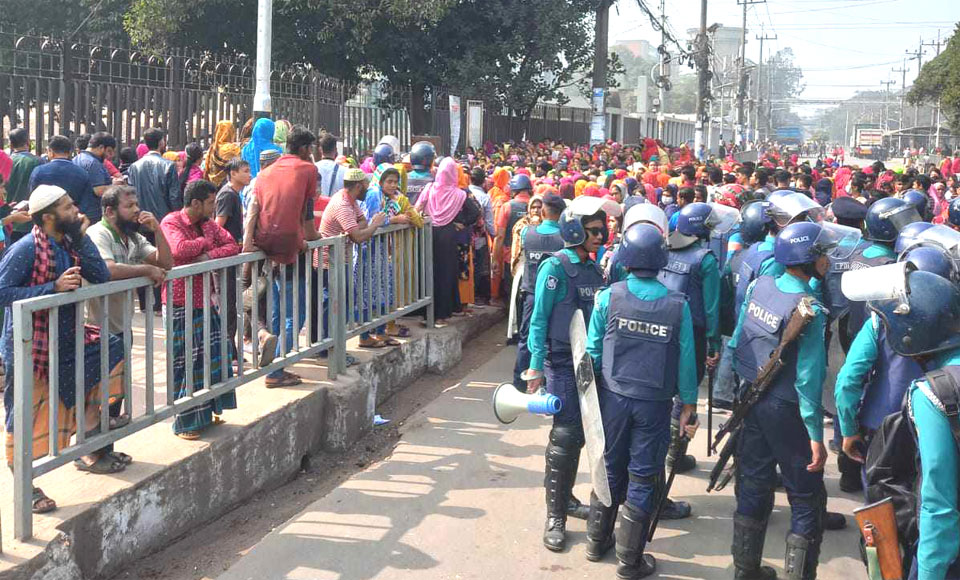 এ ঘটনায় পুলিশ ও শ্রমিকরা মুখোমুখি অবস্থান নিয়েছে। আন্দোলনের মুখে পরে অবশ্য চার হাজার টাকা বেতন বাড়ানোর আশ্বাস দিলে পরিস্থিতি কিছুটা শান্ত হয়।