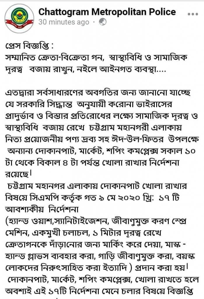 সংবাদ বিজ্ঞপ্তিতে বলা হয়, এতদ্বারা সর্বসাধারণের অবগতির জন্য জানানো যাচ্ছে যে সরকারি সিদ্ধান্ত অনুযায়ী করোনা ভাইরাসের প্রাদুর্ভাব ও বিস্তার প্রতিরোধের লক্ষ্যে সামাজিক দূরত্ব ও স্বাস্থ্যবিধি বজায় রেখে চট্টগ্রাম মহানগরী এলাকায় নিত্য প্রয়োজনীয় পণ্য দ্রব্য সহ ঈদ-উল-ফিতর উপলক্ষে অন্যান্য দোকানপাট, মার্কেট, শপিং কমপ্লেক্স সকাল ১০ টা থেকে বিকাল ৪ টা পর্যন্ত খোলা রাখার নির্দেশনা রয়েছে।