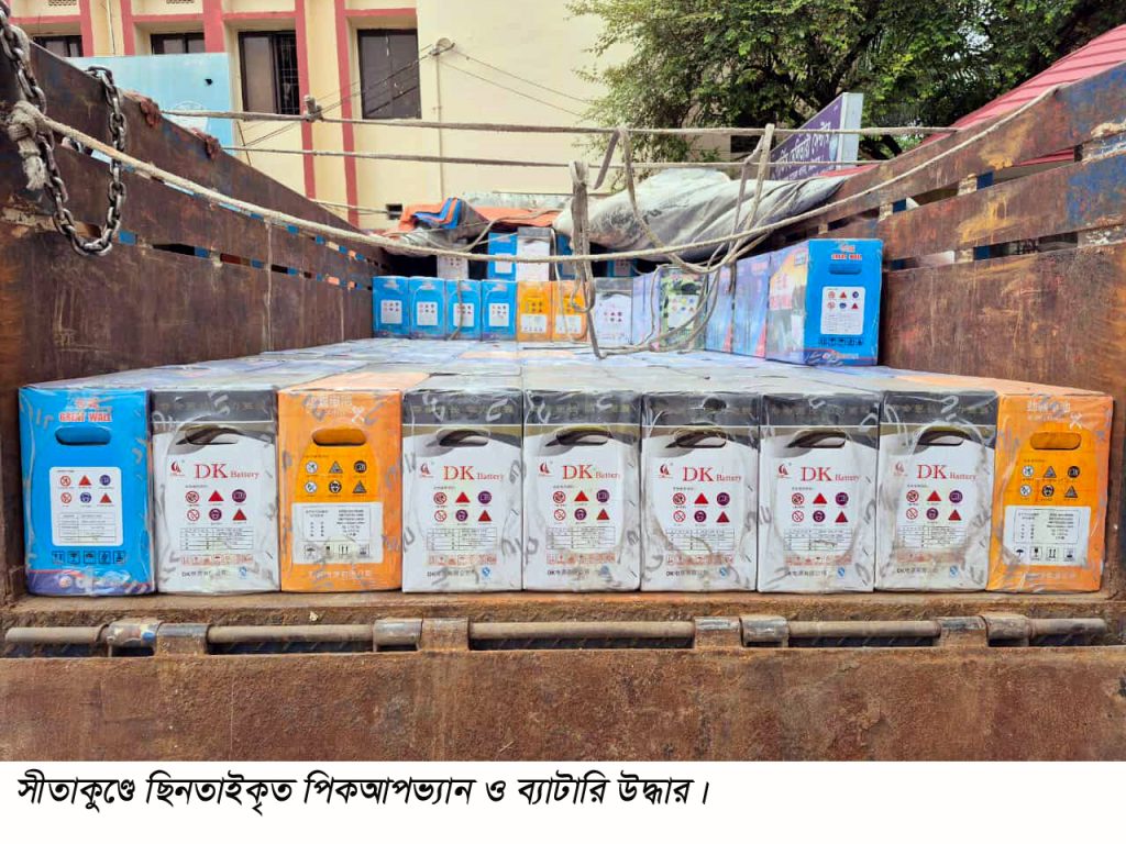 সীতাকুণ্ডে কদমরসুল এলাকা থেকে ছিনতাইকৃত পিকআপভ্যান ও ১৪২টি ব্যাটারি উদ্ধার করা হয়েছে। ছিনতাইয়ের ৩ ঘন্টার মধ্যে আবারো পুলিশ অভিযান চালিয়ে পিকআপভ্যান ও ব্যাটারি উদ্ধার করেন।