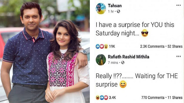 কিন্তু ফেসবুকে তাদের স্ট্যাটাস ঘিরে গুঞ্জন শুরু হয় চলতি বছরের মে মাসে। মধ্যরাতে ফেসবুকে স্ট্যাটাস দিয়ে ঝড় তোলেন তাহসান। জনপ্রিয় এ গায়ক ও অভিনেতা তার ভেরিফায়েড পেজে লেখেন, এই শনিবার রাতে তোমার জন্য একটি সারপ্রাইজ রয়েছে।