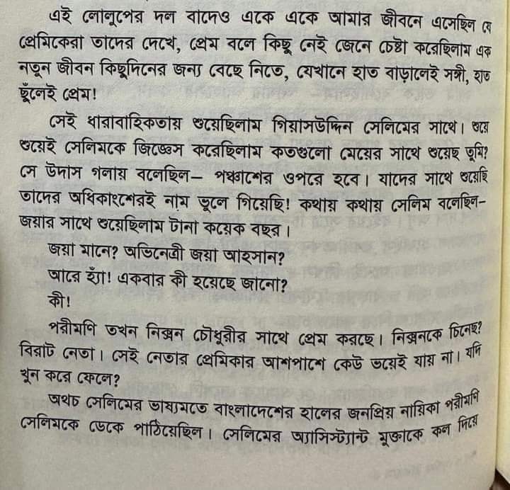 সেলিম ও প্রীতির কথোপকথনের অংশ লেখা আছে, কথায় কথায় সেলিম বলেছে—জয়ার সাথে শুয়েছি টানা কয়েক বছর। তখন প্রীতি তাকে জিজ্ঞেস করেন, জয়া মানে? অভিনেত্রী জয়া আহসান? তখন সেলিম তাকে বলেন, আরে হ্যাঁ।