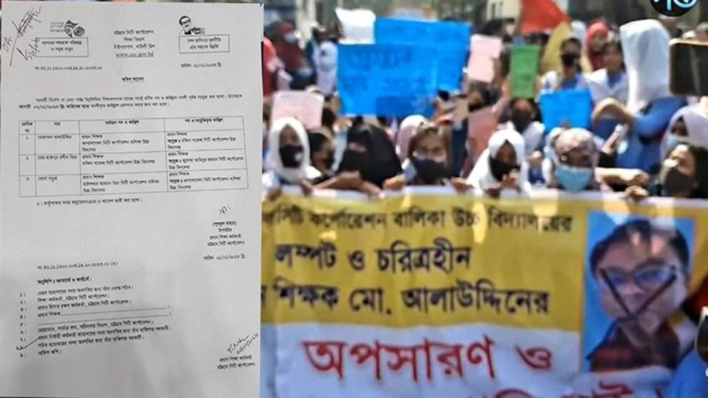 চট্টগ্রাম নগরীর চকবাজারস্থ কাপাসগোলা সিটি কর্পোরেশন বালিকা বিদ্যালয়ের প্রধান শিক্ষক মোহাম্মদ আলাউদ্দিন আহমেদের বিরুদ্ধে যৌন হয়রানির অভিযোগ অবরুদ্ধ করে উপযুক্ত শাস্তির দাবিতে মানববন্ধন করেছে ছাত্রী ও অভিভাবকরা।