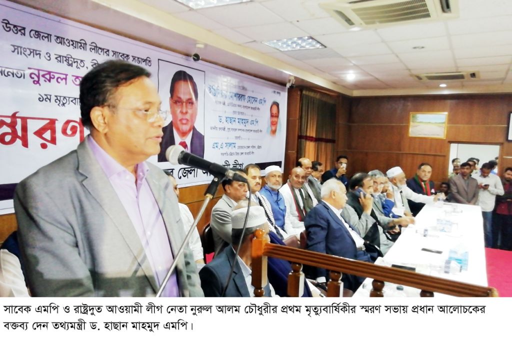 হাছান মাহমুদ বলেন, হাজার বছরের শ্রেষ্ঠ বাঙালি বঙ্গবন্ধু শেখ মুজিবুর রহমান সংসার পেতেছিলেন। সংসার কিন্তু তাঁর করা হয়নি। নুরুল আলম চৌধুরী তৃণমূল থেকে উঠে আসা রাজনীতিবিদ। ’৭৫ এর ১৫ আগস্টের পর আওয়ামী লীগের অনেকে যখন আত্মগোপনে, অনেকে ভয়ে মুখ খুলছে না, অনেকে মোস্তাকের সঙ্গে হাত মিলিয়েছে, তখন পার্লামেন্টে পার্টির সভায় যে কয়জন বিরোধীতা করেছিল মোস্তাকের এই কর্মকাণ্ডের, তাদের মধ্যে নুরুল আলম চৌধুরী একজন। নুরুল আলম চৌধুরী অত্যন্ত তরুণ বয়সে এমপি নির্বাচিত হয়েছিলেন ১৯৭৩ সালে। ১৯৮৬ সালেও তিনি এমপি নির্বাচিত হয়েছিলেন। তারপর মাননীয় প্রধানমন্ত্রী ২০০৯ সালে সরকার গঠন করার পর তাকে রাষ্ট্রদূত পদে নিয়োগ করেছিলেন।