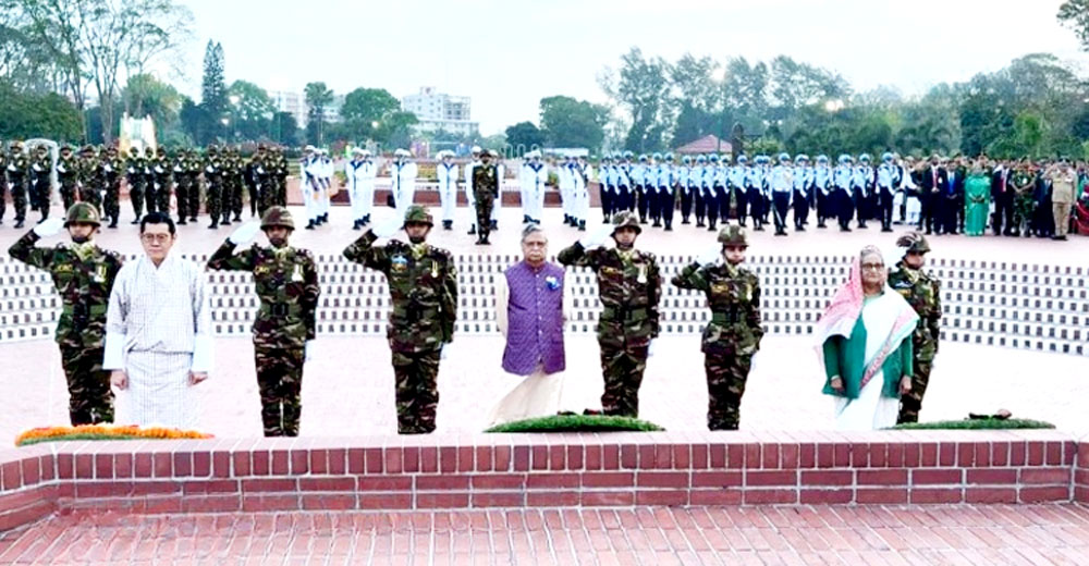 শ্রদ্ধা নিবেদন শেষে রাষ্ট্রপতি, প্রধানমন্ত্রী ও ভুটানের রাজা পরিদর্শন বইয়ে সই করেন। স্মৃতিসৌধে অন্যান্যের মধ্যে ভুটানের রানী জেৎসুন পেমা উপস্থিত ছিলেন।
