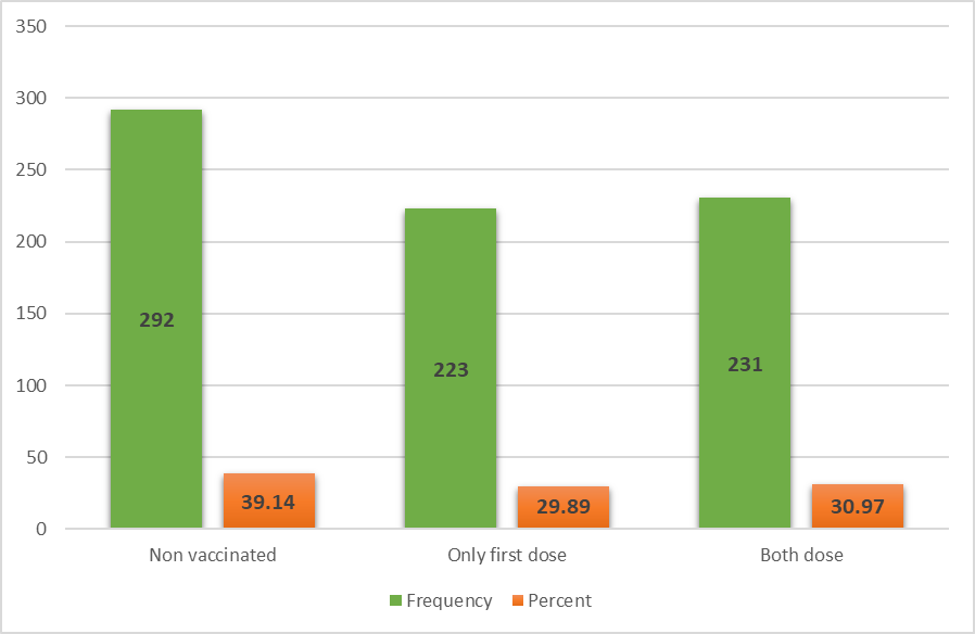 গবেষণায় দেখা যায়, স্বত:স্ফূর্তভাবে অংশগ্রহণকারী মোট ৭৪৬ জনের মধ্যে প্রায় ৩০ শতাংশ জনগোষ্ঠী (২২৩ জন) কোভিড-১৯ ভ্যাক্সিনের শুধু মাত্র প্রথম ডোজ নিয়েছেন। উভয় ডোজ নিয়েছেন প্রায় ৩১ শতাংশ (২৩১ জন) এবং ভ্যাকসিন গ্রহণ করেননি জনগোষ্ঠীর ৩৯.১৪ শতাংশ (২৯২জন) (চিত্র: ১ থেকে বর্ণিত)।