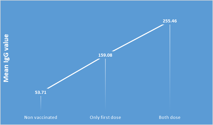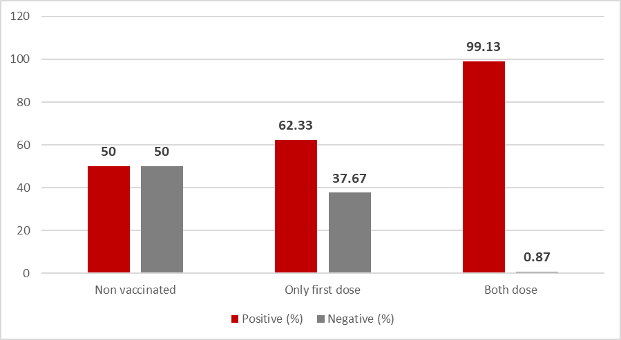 লক্ষণীয় যে, প্রথম ডোজ টিকা গ্রহণকারীদের মধ্যে ৬২.৩৩ শতাংশের দেহে এন্টিবডি শনাক্ত হয়েছে। অপরদিকে, উভয় ডোজ টিকা গ্রহণকারী জনগোষ্ঠীর ৯৯.১৩ শতাংশের মধ্যে এন্টিবডি শনাক্ত হয়েছে। অথচ যারা ভ্যাকসিন গ্রহণ করেননি তাদের মধ্যে মাত্র ৫০ শতাংশের দেহে প্রাকৃতিকভাবে সার্স কোভ-২ ভাইরাসের বিরুদ্ধে এন্টিবডি (IgG) পাওয়া গিয়েছে (চিত্র: ২ থেকে বর্ণিত)।