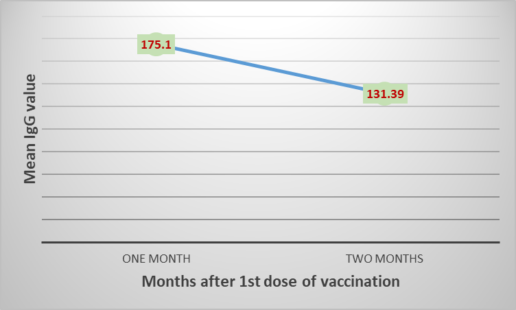 চিত্র:৪ জরিপে অংশগ্রহণকারি জনসংখ্যায় যারা ১ম ডোজ ভ্যাকসিন গ্রহণ করেছেন তাদের এন্টিবডির (IgG) পরিমাণ (গড়) সময়ের সাথে হ্রাস পাওয়ার প্রবণতা