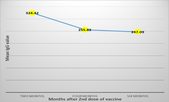 চিত্র: ৫ জরিপে অংশগ্রহণকারী জন সংখ্যায় যারা ২য় ডোজ ভ্যাকসিন গ্রহণ করেছেন তাদের এন্টিবডির (IgG) পরিমাণ (গড়) সময়ের সাথে হ্রাস পাওয়ার প্রবণতা