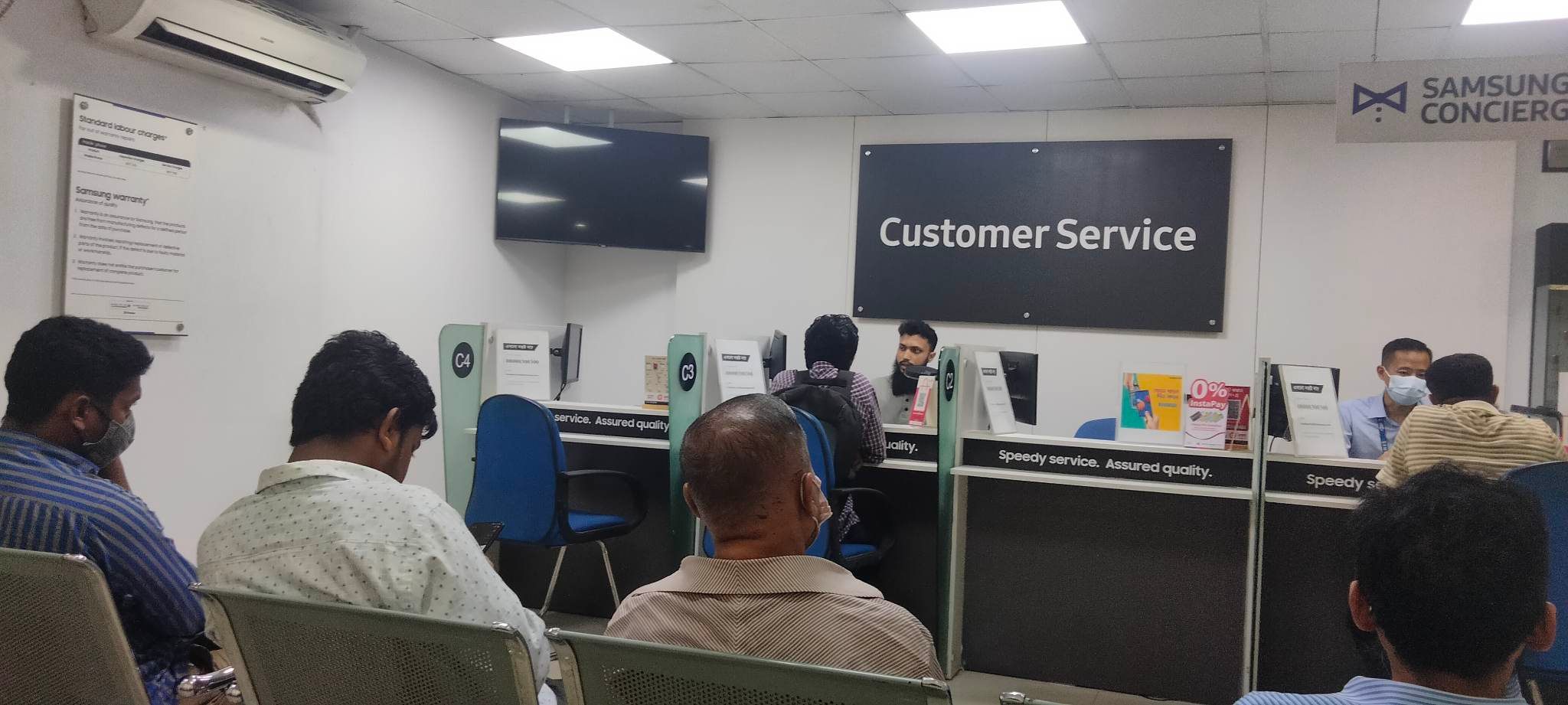 স্যামসাং সার্ভিস সেন্টারে গেলে দেখা মেলে ‘স্পিডি সার্ভিস, এসিউরড কোয়ালিটি’ লেখা সম্বলিত সাইনবোর্ড। যার অর্থ দাঁড়ায় দ্রুত সেবা, নিশ্চিত গুণমান। কিন্তু বাস্তব এর পুরোটাই বিপরীত। কেয়ারে ঘন্টার পর ঘন্টা দাঁড়িয়ে থেকেও মেলেনা সেবা। যেন গ্রাহকদের সময়ের মূল্যই নেই!—নগরীর ২নং গেইটে অবস্থিত স্যামসাং কাস্টমার কেয়ারে সরেজমিনে গিয়ে দেখা গেছে এমন চিত্রই।