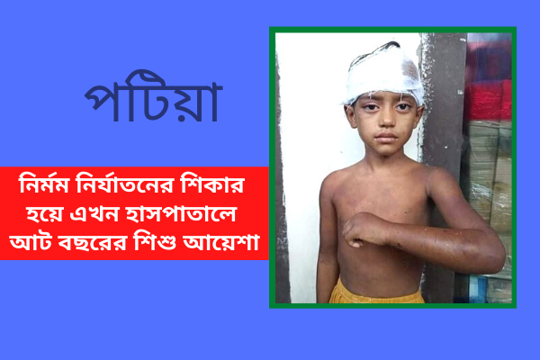 চট্টগ্রামের পটিয়া উপজেলার শোভনদন্ডী ইউনিয়নের রশিদাবাদ এলাকায় আয়েশা আক্তার (৮) নামে এক শিশু কন্যাকে সৎ মায়ের নির্যাতনের অবিযোগ পাওয়া গেছে। আট বছরের শিশু আয়েশা আক্তার নির্মম নির্যাতনের শিকার হয়ে এখন হাসপাতালে।
