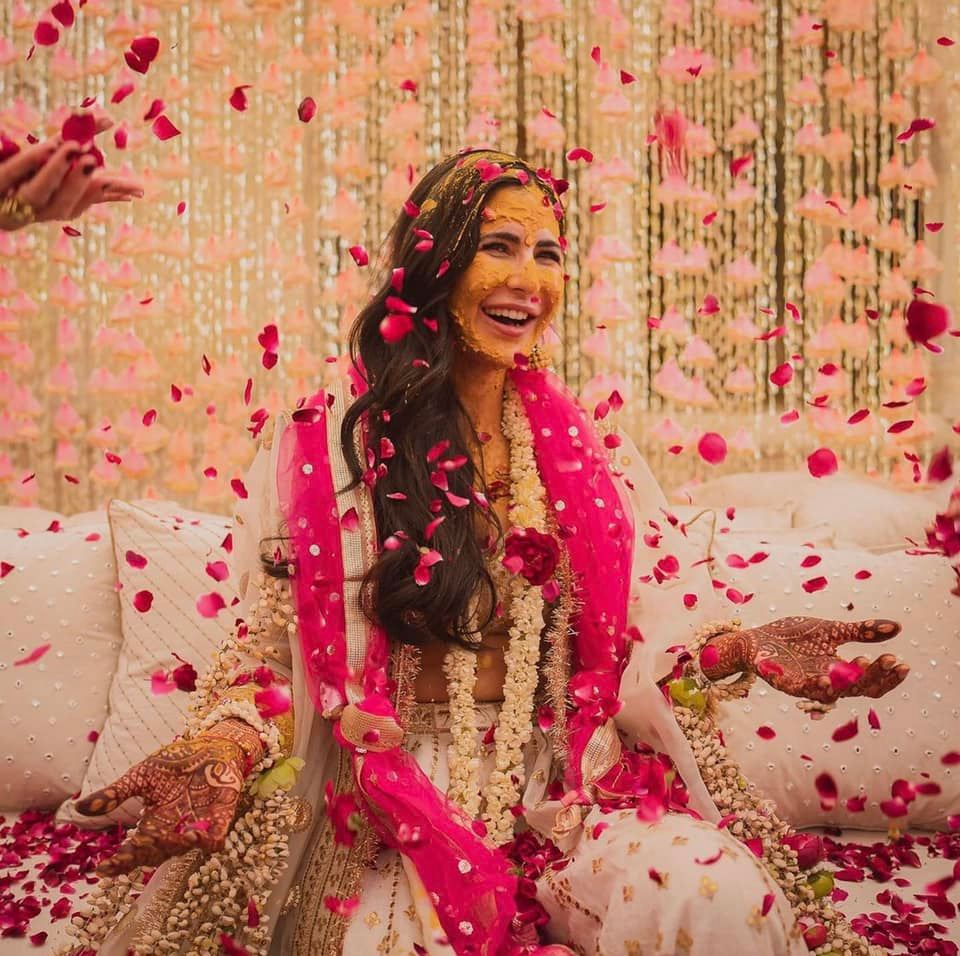 গায়ে হলুদের অনুষ্ঠানে ভিকি-ক্যাটরিনা দু’জনেই রঙ মিলিয়ে সাদা ট্র্যাডিশনাল পোশাক পরেছেন। ক্যাটরিনা সেই সঙ্গে পরেছেন মানানসই জুঁই ফুলের গয়না।