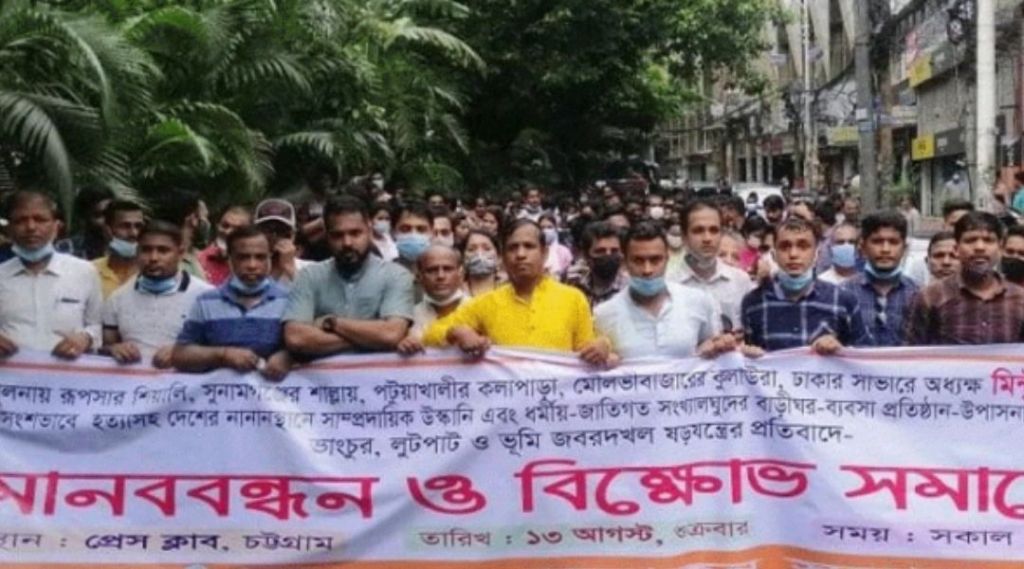 খুলনার রূপসা উপজেলার শিয়ালী গ্রামে সনাতনী সম্প্রদায়ের চারটি মন্দির, হিন্দু সম্প্রদায়ের বেশ কিছু দোকান, কয়েকটি বাড়িতে ভাংচুর-লুটপাট, ঢাকার সাভারে অধ্যক্ষ মিন্টু চন্দ্র বর্মনকে নিশংস হত্যাসহ দেশের বিভিন্ন স্থানে সাম্প্রদায়িক হামলা এবং ধর্মীয় উস্কানির প্রতিবাদে চট্টগ্রামে মানববন্ধন ও বিক্ষোভ সমাবেশ অনুষ্ঠিত হয়েছে।