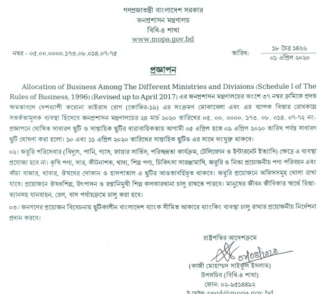 বুধবার ৫ থেকে ৯ এপ্রিল ছুটি ঘোষণা করে জনপ্রশাসন মন্ত্রণালয় থেকে প্রজ্ঞাপন জারি করা হয়েছে।