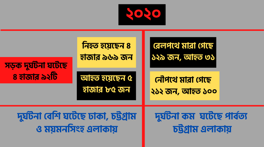 পরিসংখ্যান তুলে ধরে এসময় তিনি বলেন, ২০২০ সালে রেলপথের দুর্ঘটনায় ১২৯ জন নিহত ও ৩১ জন আহত হয়েছেন এবং নৌপথের দুর্ঘটনায় ২১২ জন নিহত ও ১০০ জন আহত বা নিখোঁজ হন। গত বছরের জানুয়ারি মাসে বেশি ৪৪৭টি দুর্ঘটনা ঘটে। এতে ৪৯৫ জন নিহত ও ৮২৩ জন আহত হন। আর এপ্রিল ও মে মাসে সবচেয়ে কম যথাক্রমে ১৩২ ও ১৯৬টি দুর্ঘটনা ঘটে। এর কারণ হিসেবে বলা হয়, করোনাভাইরাস সংক্রমণ রোধে দেশে লকডাউন থাকায় দুর্ঘটনা কম হয়েছে।