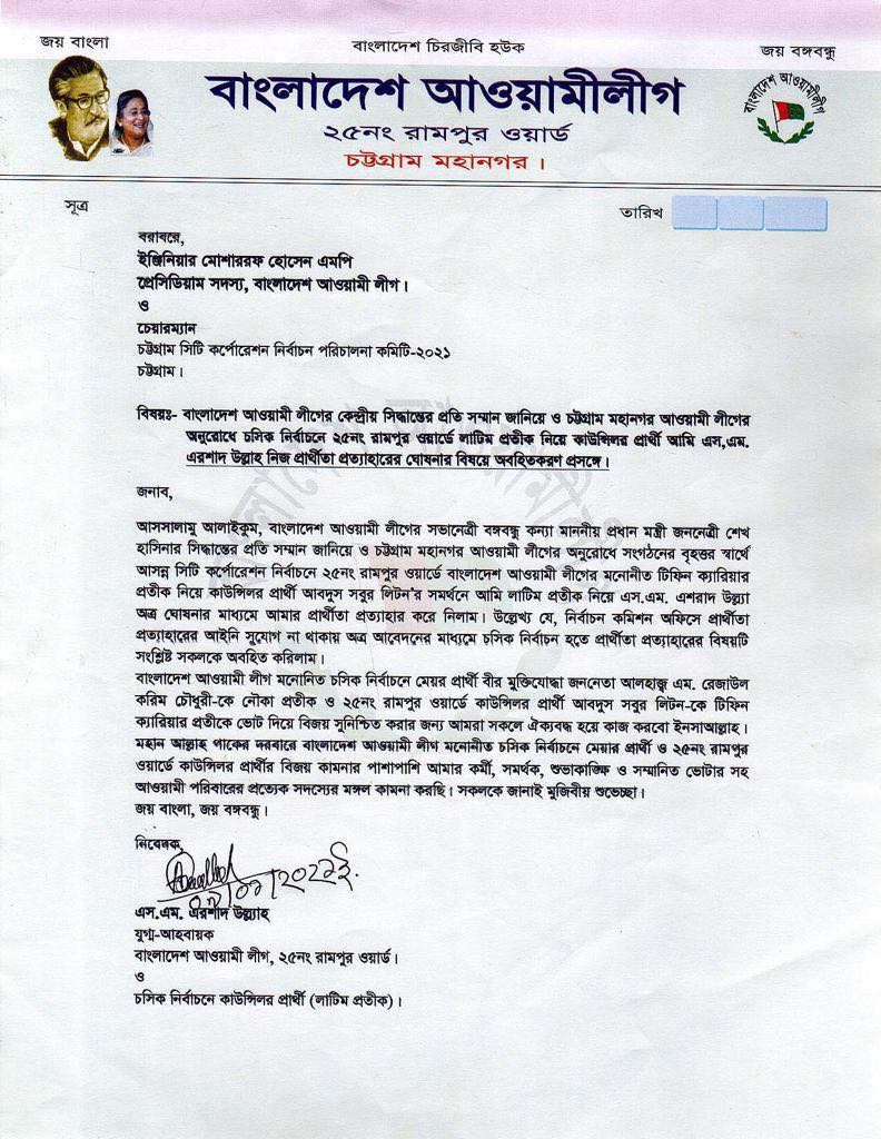 এরশাদ উল্ল্যাহ আওয়ামী লীগের নির্বাচন পরিচালনা কমিটির চেয়ারম্যান ইঞ্জিনিয়ার মোশাররফ হোসেন এবং নগর আওয়ামী লীগের ভারপ্রাপ্ত সভাপতি-সাধারণ সম্পাদক বরাবর পৃথক দুটি চিঠি লিখে তার প্রার্থিতা প্রত্যাহারের বিষয়টি অবহিত করেছেন।