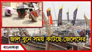 জাল বুনে ও নৌকা মেরামত করে সময় পার জেলেদের