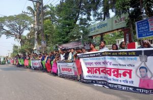বাঁশখালীতে গৃহবধূ আঁখি হত্যাকারীদের ফাঁসির দাবিতে মানববন্ধন