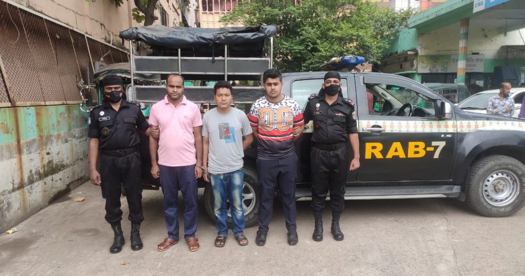 আটকরা হলেন- নারায়নগঞ্জ জেলার নারায়নগঞ্জ থানার খর্দ্দঘোষ পাড়া এলাকার মো. গোলাম মোস্তফার ছেলে মো. মাইন হাছান রাকিব (২৩), রাঙ্গামাটি জেলার কাউখালী থানার নাভাঙ্গা এলাকার মনকুমার চাকমার ছেলে রিটন চাকমা (২৪), পটুয়াখালী জেলার দুমকি থানার রাজাখালী এলাকার মো. ইউসুফ হাওলাদারের ছেলে মো. রবিউল ইসলাম (৩০)।
