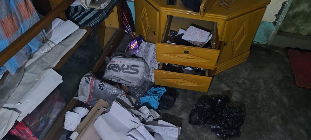 হারুন অর রশিদের স্ত্রী নাছিমা আক্তার বলেন, আমার স্বামী ব্যবসায়ীক কাজে শহরে রয়েছে, আমিও বাবার বাড়িতে ছিলাম। আমার মেয়েরা ঘরের গ্রীলের তালা লাগিয়ে রাতে আমার ভাসুরের ঘরে ছিল। শনিবার সকালে ঘুম থেকে উঠে দেখে ঘরের গ্রিলের তালা কাটা। পরে ঘরে ঢুকে দেখে আলমিরা, ওয়ারড্রব সব তছনছ করে ফেলেছে। খবর পেয়ে আমি দ্রুত বাবার বাড়ি থেকে ছুটে আসি। দেখি সবকিছু তছনছ করে চোরের দল আলমিরায় থাকা একটি গলার নেকলেস, স্বর্ণের চেইন, কানের দুল, আংটি ও নগদ ২ লাখ ৭০ হাজার টাকা নিয়ে গেছে। ঘরের বারিন্দায় রাখা মোটরসাইকেলও নিয়ে যাওয়ার চেষ্টা করে। কিন্তু তা নিতে পারেনি।