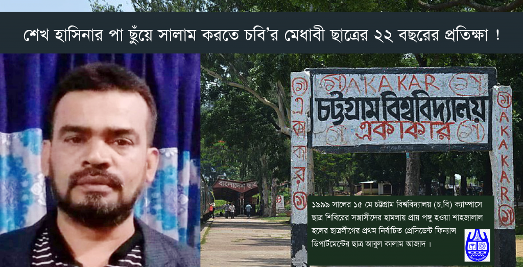 আওয়ামী লীগের সভাপতি বঙ্গবন্ধু কন্যা শেখ হাসিনার পা ছুঁয়ে সালাম করতে প্রায় ২২ বছরের অধিক সময় প্রতিক্ষা করছেন ১৯৯৯ সালের ১৫ মে চট্টগ্রাম বিশ্ববিদ্যালয় (চবি) ক্যাম্পাসে ছাত্র শিবিরের সন্ত্রাসীদের হামলায় প্রায় পঙ্গু হওয়া (বর্তমানে মানসিক ভারসাম্যহীন) চট্টগ্রাম বিশ্ববিদ্যালয়ের শাহজালাল হলের ছাত্রলীগের প্রথম নির্বাচিত প্রেসিডেন্ট ফিন্যান্স ডিপার্টমেন্টের (এমবিএ) ছাত্র আবুল কালাম আজাদ।